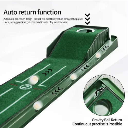 Enjoy auto-return, dual holes, alignment guides, and slope in one complete putting mat. Train like a pro at home without breaking the bank.